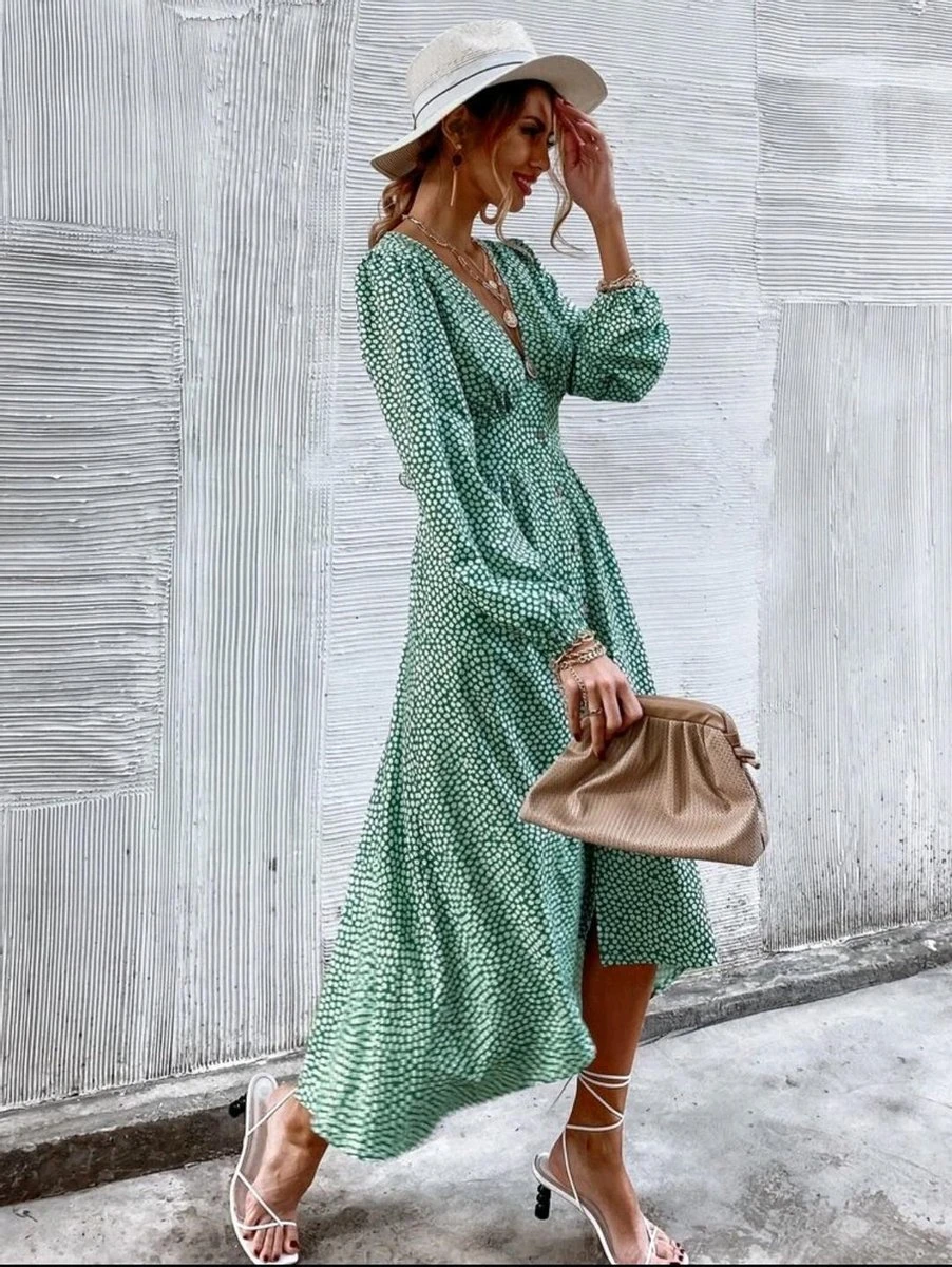 BESCHRIJVING Stijl: Boho Kleur: Groen Patroon type: Vrolijke Bloemetjes Neklijn: Lange V-hals Lengte: Lang Type: A Lijn Details: Knoop Mouw lengte: Lange mouwen Type mouwen: Gewone mouw Seizoen: Lente/Herfst Taille : Hoge taille Type fit: Normale Fit Doorzichtig: Nee Afwerking: Klokrok Materiaal: Polyester Materiaal: 65% Polyester, 30% Spandex, 5% Katoen Stof: Niet stretchy